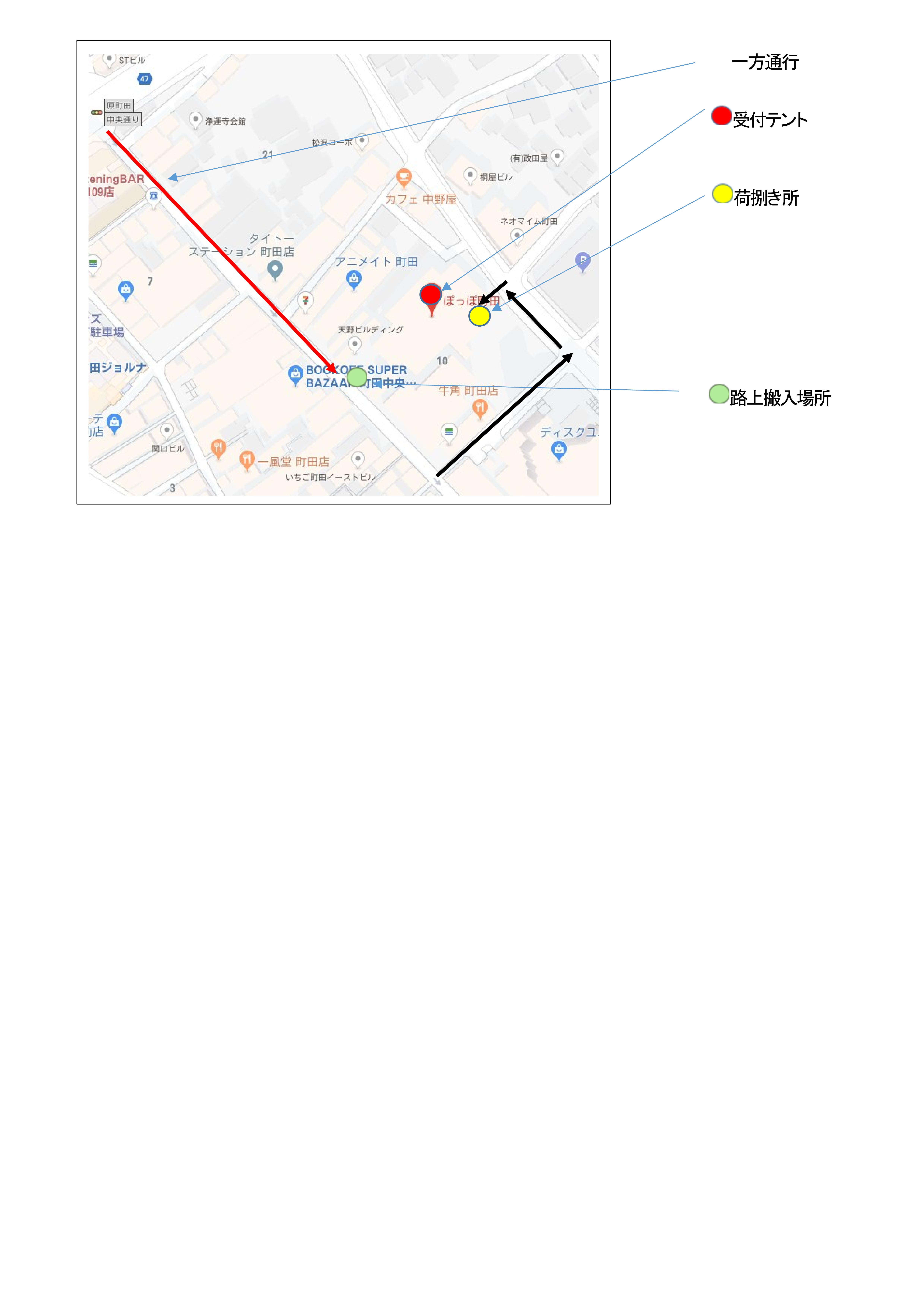 荷捌き所ご希望の方は、まず「路上搬入場所」のぽっぽ町田施設入口に停車し、上記受付テントで車両証を受け取り、黒矢印のように搬入口へお進みください。ご通行の方のご迷惑にならない配慮をお願いいたします。【開催時間中、4台分駐車スペース確保(1,500円/1日)しております。ご希望の方はお問い合わせください】